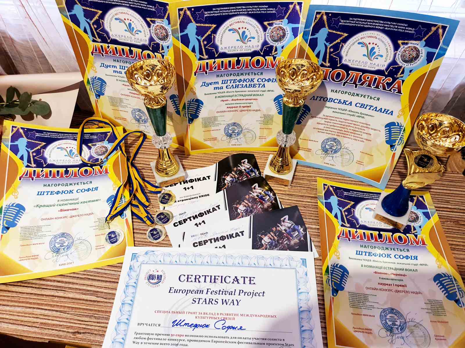 4. Дует: Софія та Єлизавета Штефюк – 1 місце, Дутчак Катерину – 1 місце та спец-приз за «За артистичність та автентичність народного мистецтва», Штефюк Софія – 1 місце та спец-приз за «Найкращий сценічний костюм» в Міжнародному онлайн-конкурсі мистецтв «Джерело надії» – м.Київ, 2021 р.